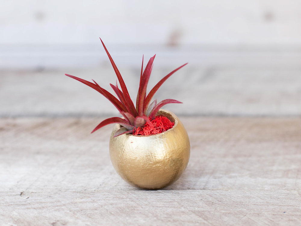 Add a bit of gilded glamour to your space with this stylish metallic gold air plant pod. We've hand-painted natural wood seed pods with a metallic gold finish to create the perfect air plant display. You customize your look by choosing your air plant and moss. These make the perfect accents to a shelf, nightstand, table, or even as a fun and modern accent to brighten up your desk space.